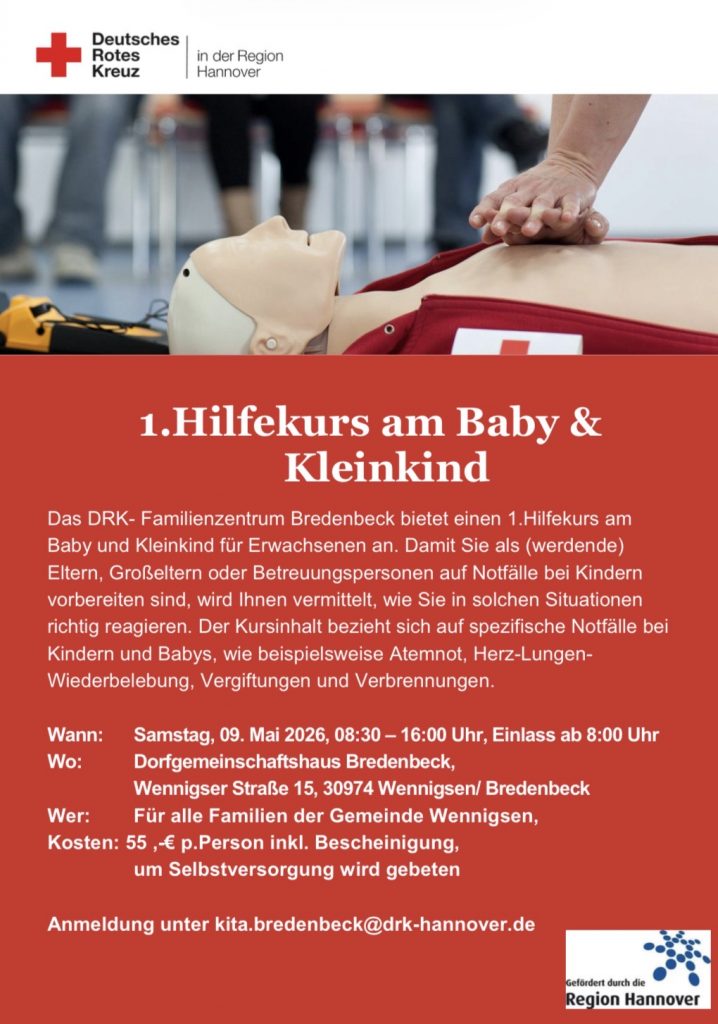 Das DRK-Familienzentrum in Bredenbeck, das seit Ende letzten Jahres in den Räumlichkeiten des Dorfgemeinschaftshauses lokalisiert ist, bietet Eltern, Großeltern und Betreuungspersonen einen 1. Hilfekurs, um in kritischen Situationen mit den Babys und Kleinkindern richtig handeln zu können.